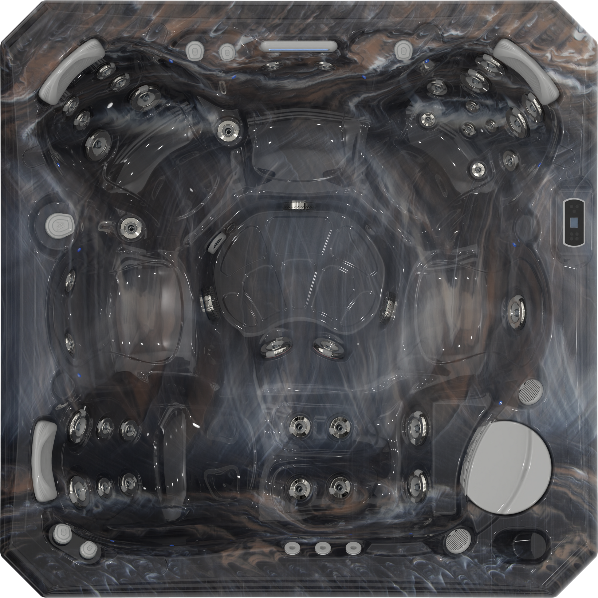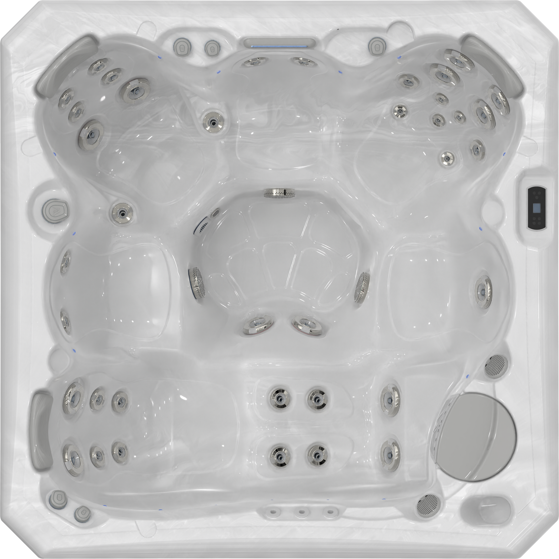 Stemningsfulle undervanns-LED-lys (10–20 stk, avhengig av modell) integrert i sideveggene, som lyser i harmoni med det sentrale kromoterapilyset.